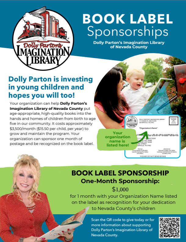 Our partnership with Dolly Parton's Imagination Library ensures all Nevada County children can have a great selection of books at home. Thank you for being a champion of literacy, a supporter of dreams, and a beacon of hope for children in Nevada County. Together, we can make a difference, one book at a time.