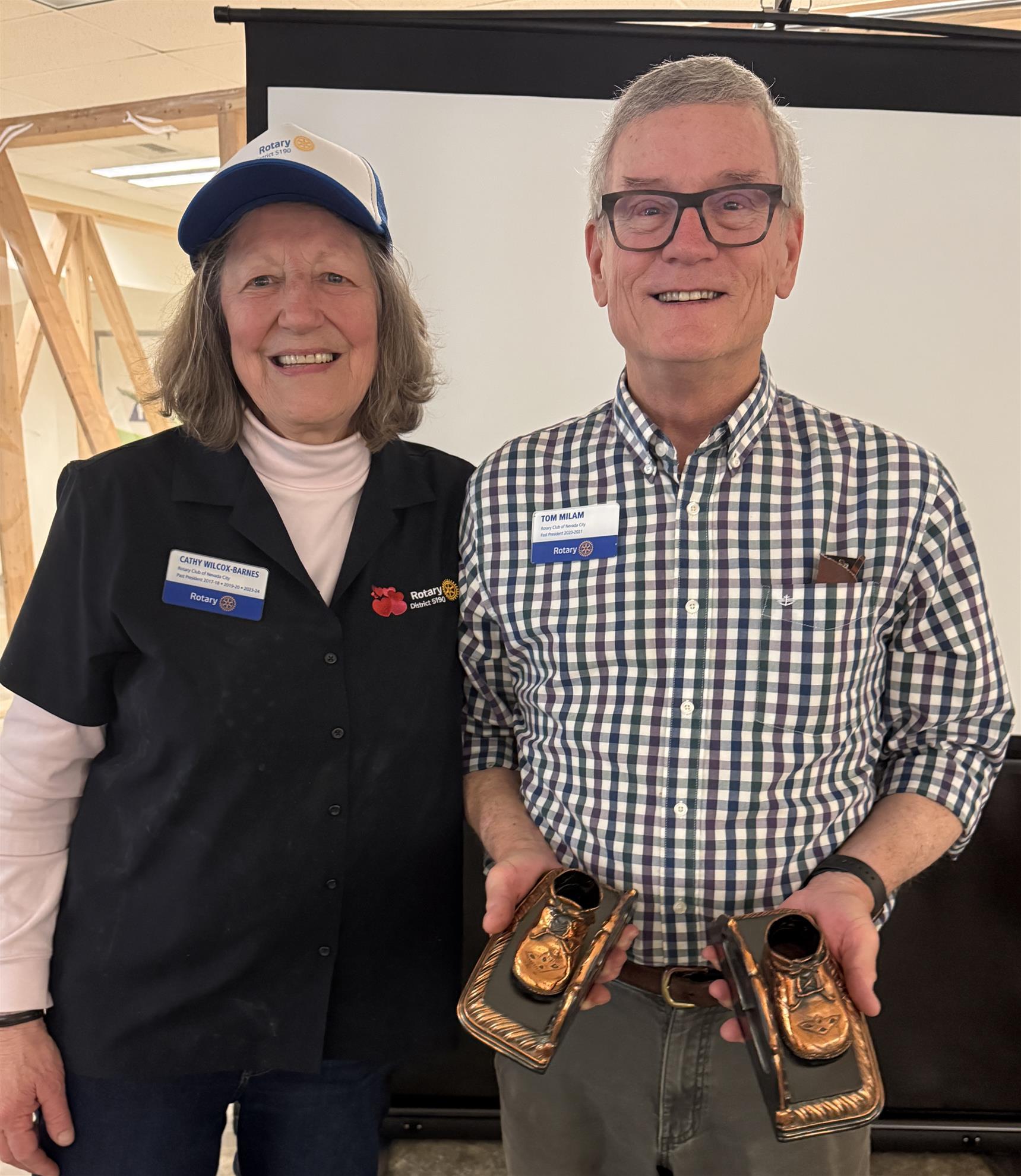 During Thursday’s meeting several awards were presented. PE Pearce Boyer was presented his 3rd PHF and Kelly was presented with her first Paul Harris Award and her Paul Harris Society Certificate. Top Gun Conference participants reported on how much fun DG Dennis’ conference. District SAA Chair Cathy also presented Tom with her SAA Jumping In With Both Feet Award for his continuous support throughout the conference.